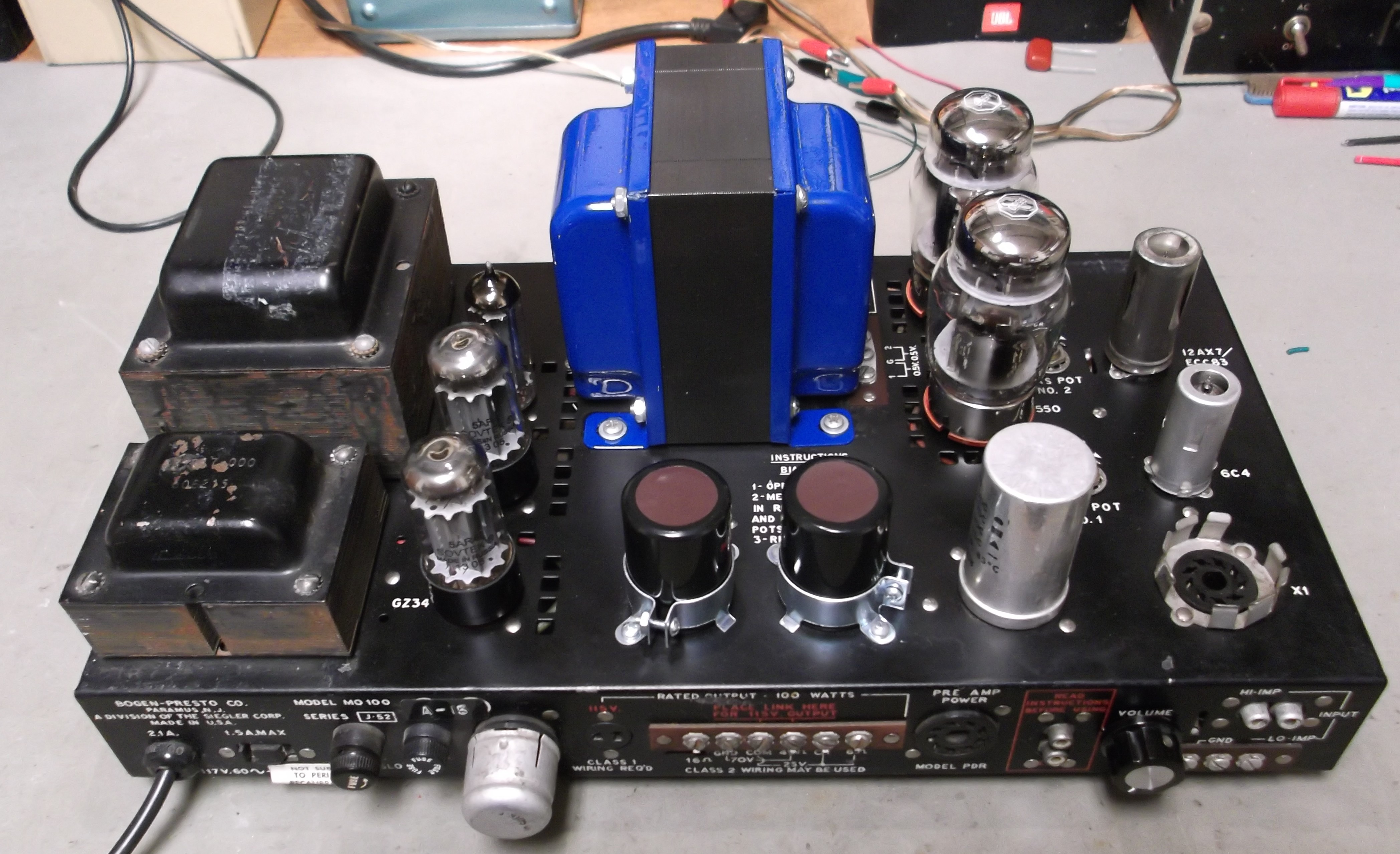 The Bogen MO-100 was originally designed for constant-voltage audio distribution, rated at 100 watts, and very configurable to various installations. The customer has two of these, and this is the second one in for restoration. After some basic checks, the power supply filters and all internal coupling capacitors were replaced, a new power cord installed, and a new volume control & knob installed. Everything checked out at DC, so it was time to try it on an audio generator and the oscilloscope.