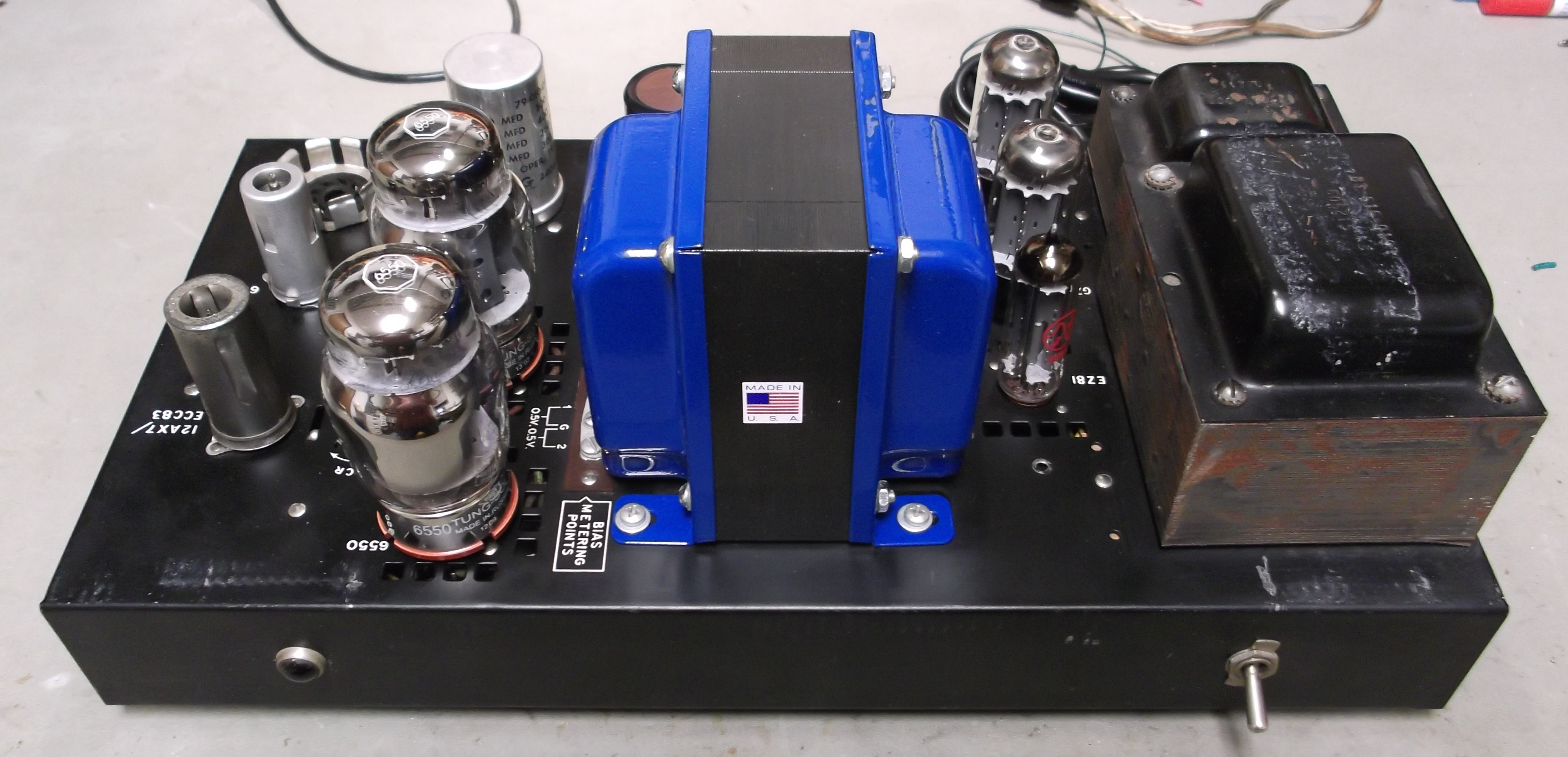 The original output transformer had a shorted turn in it. Only 3 watts of the rated output made it to the load. After that, when the primary impedance was measured, the shorted turn was discovered. 1000 ohms was measured with no load. This should measure very high (a theoretically perfect transformer would measure OPEN). Oh, what to do!