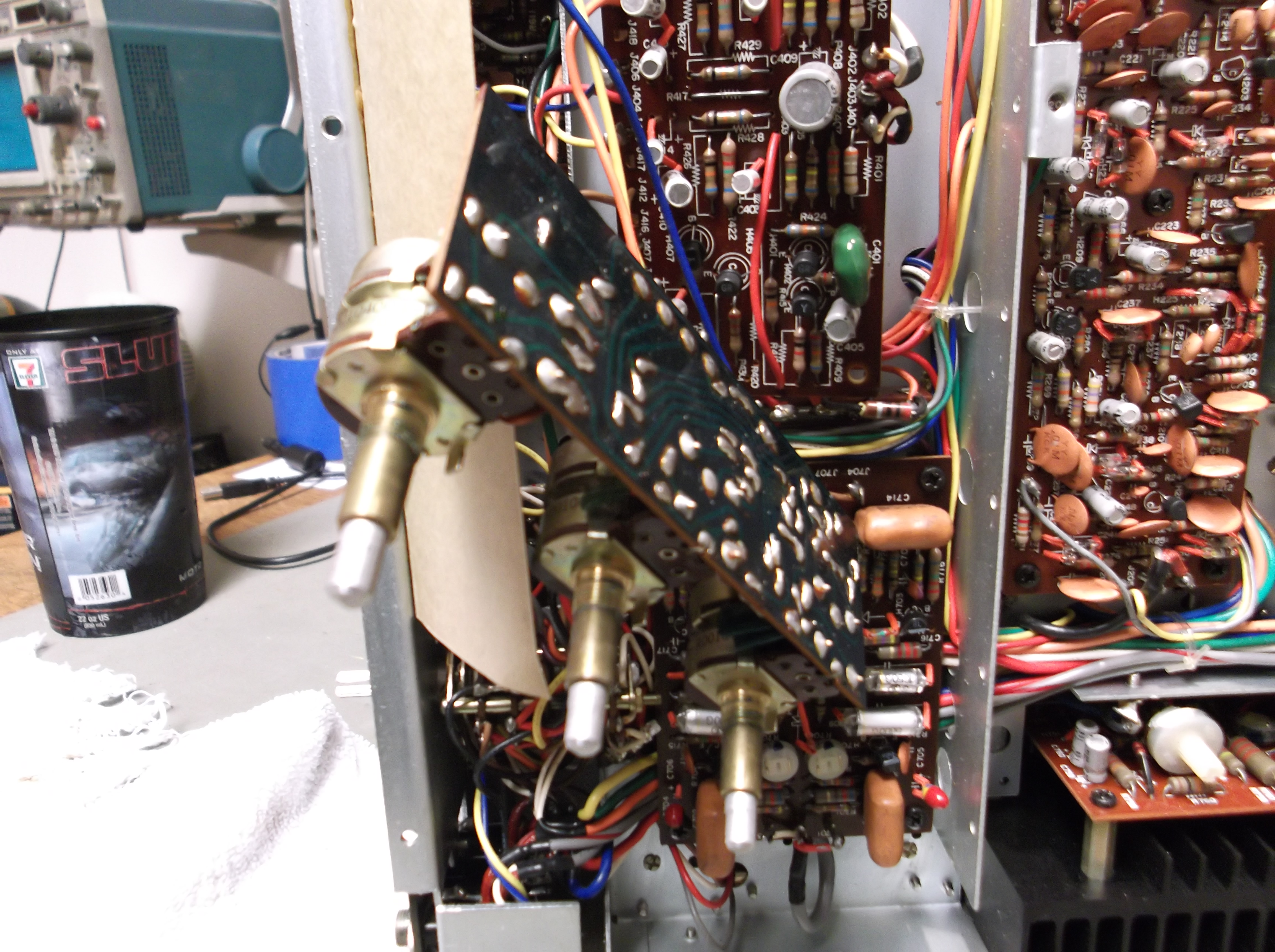 This is the tone control PCB. Taking it out allowed some cleaning spray to be sprayed into the potentiometers. Behind this PCB you can see the original capacitors on the preamplifier PCB.