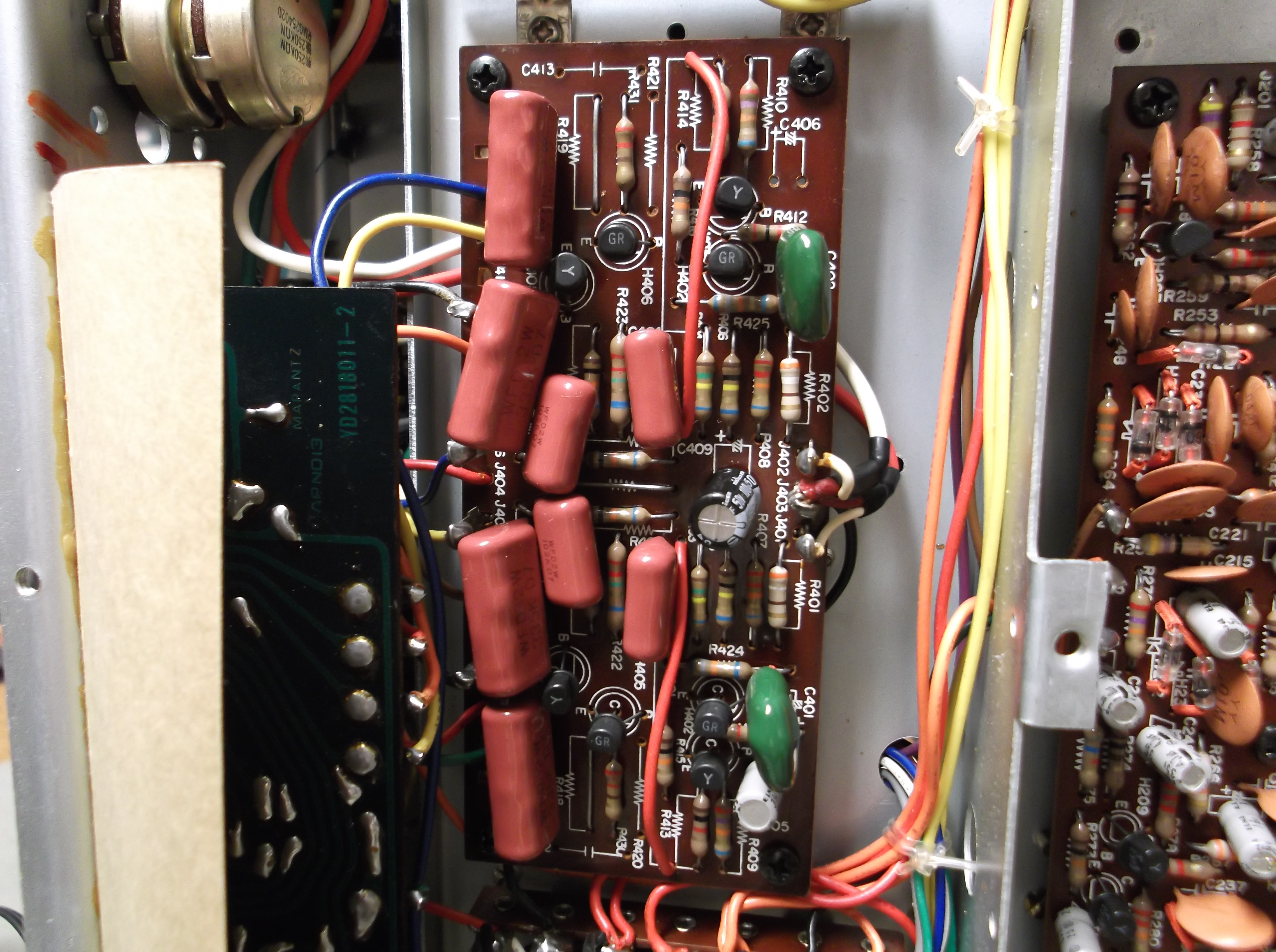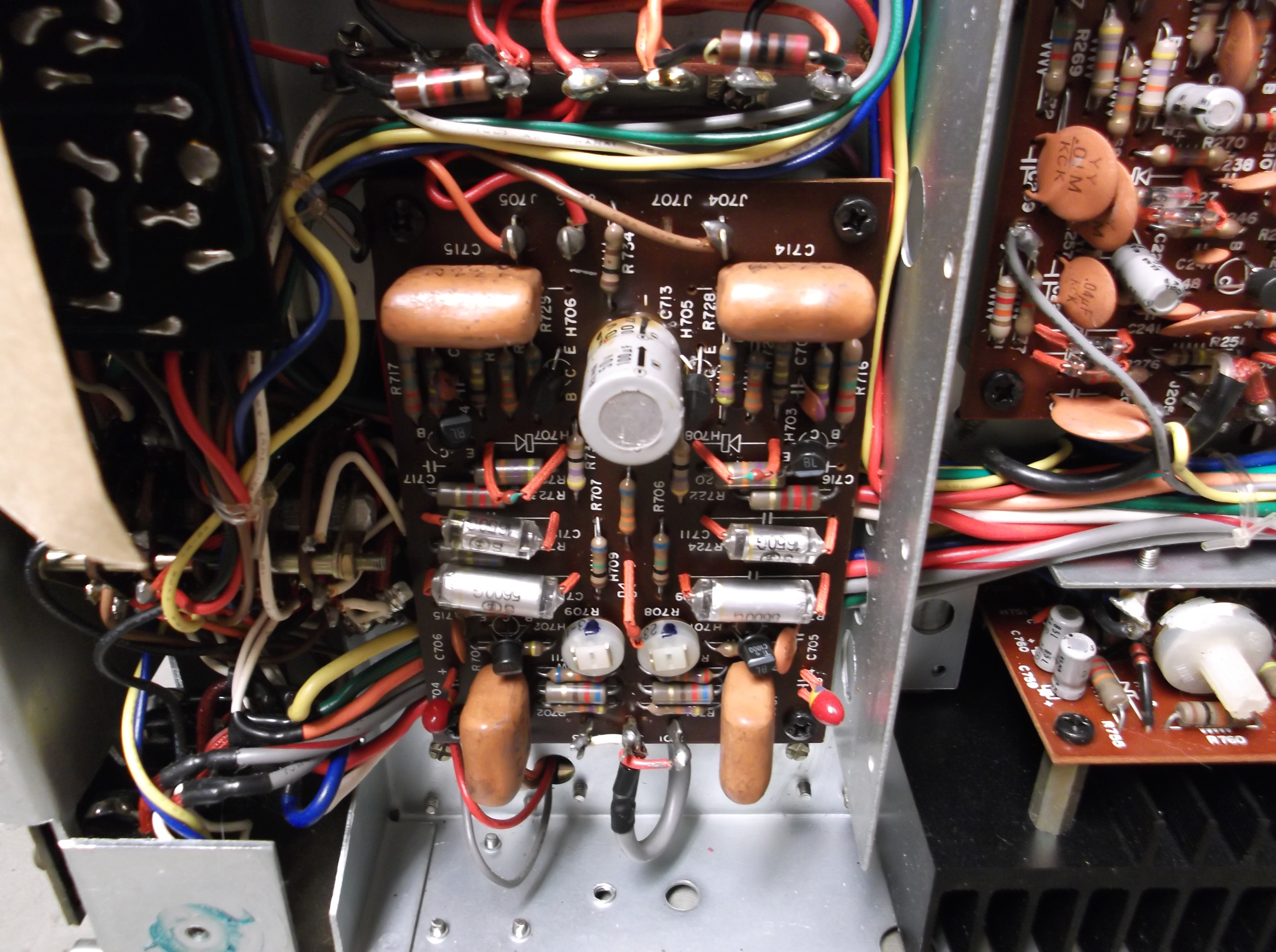 Also replaced but not photographed were two hard-to-reach capacitors on each power output module. Each module needed to be disconnected and removed! While these were out, one transistor was replaced on each module to comply to a Marantz service bulletin. Apparently they lost faith in the part they originally selected.